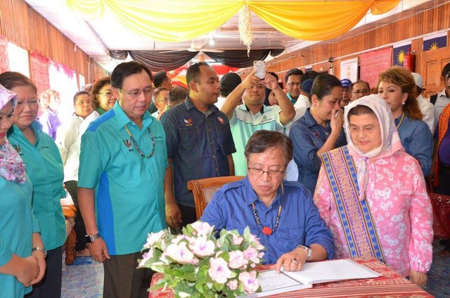 22 April 2017 | Aktiviti TerkiniBINYO: Abang Johari menekan butang khas sebagai simbolik perasmian SARES di Rumah Irai, Sungai Binyo sambil disaksikan Uggah berserta tetamu kehormat lain.