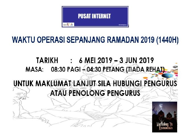 3 May 2019 | Aktiviti TerkiniBerikut adalah Notis Waktu Operasi Pusat Internet Sebauh pada bulan Ramadhan bermula 6 Mei - 3 Jun 2019