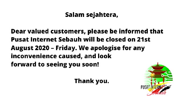 Berikut merupakan notis penutupan PI Sebauh pada Jumaat, 21 Ogos 2020. PI Sebauh akan beroperasi seperti biasa pada 22 Ogos 2020 – Sabtu. Terima kasih