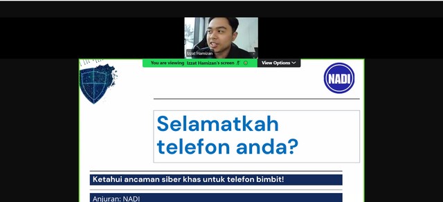 Pada 14 Ogos 2025, Webinar Selamatkah Telefon Anda Dari Ancaman ini bertujuan meningkatkan kesedaran keselamatan siber dalam penggunaan telefon pintar. Peserta diberi pendedahan tentang pelbagai ancaman digital yang boleh berlaku melalui aplikasi, rangkaian, dan pautan mencurigakan.Telefon pintar ialah peranti penting harian tetapi mudah terdedah kepada serangan siber jika pengguna cuai. Dengan pengetahuan dan amalan keselamatan yang betul, setiap individu mampu melindungi data serta privasi mereka. Webinar ini berjaya menanamkan kesedaran tentang pentingnya kebersihan digital (digital hygiene) demi keselamatan kendiri.